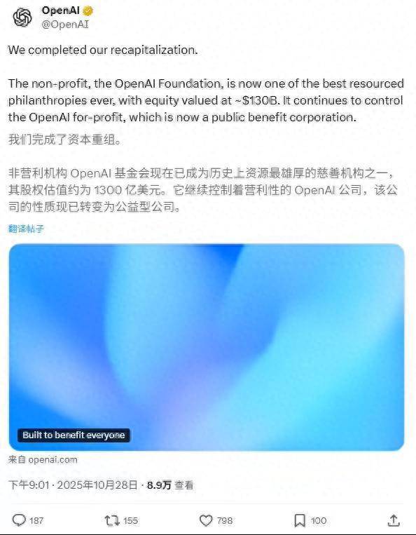 随着资本重组完成,OpenAI 获得了继续推进 AI 前沿研究的能力,并通过更新的公司结构,确保技术进步能服务于所有人。